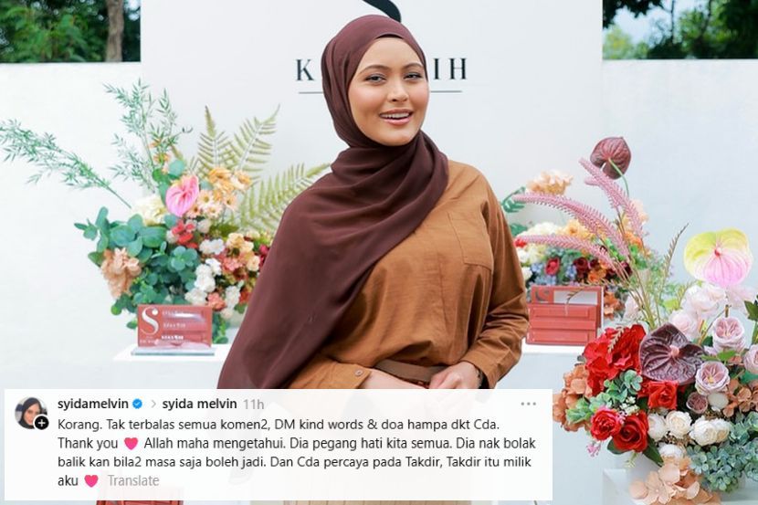 SELEPAS kisah perceraian menjadi bualan, pelakon Syida Melvin berkongsi luahan hati dan takdir dalam perkahwinan.Menurut Syida atau Nur Syifa Assyidda Amirol Melvin, 29, dia percaya setiap yang berlaku adalah ketentuan Yang Maha Esa. “Allah Maha Mengetahui. Dia pegang hati kita semua.“Dia nak bolak-balikkan bila-bila masa sahaja, boleh jadi. Saya percaya pada takdir,” kongsinya.Luahan Syida di Threads. Syida menulis perkara tersebut dalam satu hantaran di Threads.Dia turut mengucapkan penghargaan kepada orang ramai yang berterusan memberikan sokongan buat dirinya dalam berdepan ujian.“Tidak terbalas semua komen, mesej, kata-kata baik dan doa anda semua,” luahnya.Perkongsian tersebut mendapat pelbagai respons termasuk kata-kata semangat mendoakan buat Syida.ARTIKEL BERKAITAN: Syida Melvin fail cerai terhadap suami ARTIKEL BERKAITAN: Syida jawab tak sebulu dengan adik-beradik Melvin, gerak solo hasil produk sendiriMalah, ada juga yang meminta untuk dia terus mempertahankan rumah tangga."Semoga terus kuat dan dipermudahkan urusan Syida dan keluarga."Janganlah cerai tau... Semoga jodoh masih bersama kalian," antara komen netizen.Syida memfailkan cerai terhadap suaminya. Syida dilaporkan telah memfailkan cerai terhadap suaminya, Syafiq Azim di Mahkamah Rendah Syariah Shah Alam, Selangor pada Disember tahun lalu.Perkara itu disahkan oleh peguam yang mewakili Syida iaitu Nurul Jamaliah yang memaklumkan bahawa prosiding berkaitan rumah tangga pasangan itu kini sedang berjalan di mahkamah.Untuk rekod, Syida atau Nur Syifa Assyidda Amirol Melvin, 29, mendirikan rumah tangga dengan Mohamad Syafiq Azim Shaheen, 37, pada 19 Januari 2019.Hasil perkahwinan itu, mereka dikurniakan tiga orang cahaya mata iaitu Safa Safeera, Sara Sajedda dan Serhan Isa.Jadilah sebahagian daripada geng mStar! Follow kami di Telegram, Twitter, TikTok, Facebook, Instagram dan YouTubeTONTON VIDEO PILIHAN!