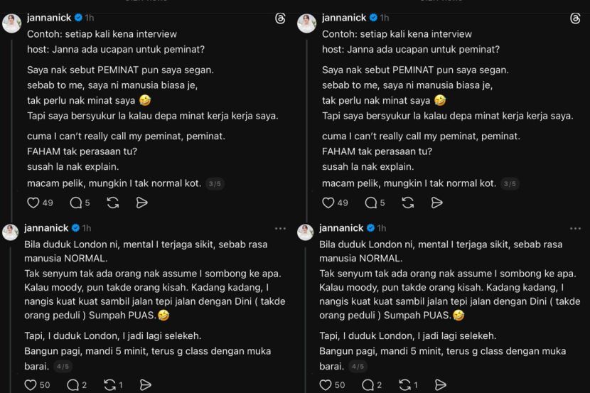 DISEBUT antara artis yang sombong ketika bertemu peminat, pelakon Janna Nick tampil menjelaskan salah faham ramai mengenai sikapnya itu.Kata Janna atau nama sebenarnya Nurul Jannah Muner, 30, dia lebih kepada kurang yakin diri kerana sifat semula jadinya yang tidak terlalu mementingkan penampilan semasa di luar waktu kerja. “Siapa artis sombong? Salah. Siapa artis insecure? Saya. Saya jenis bersiap bila kena kerja saja, kalau tak memang selekeh dan tak glamour langsung.Janna jawab dakwaan sombong.“Kalau jalan-jalan dan orang kenal, saya jadi malu. Saya tak anggap diri artis pun. Kalau orang tak tegur, saya anggap mereka tak kenal saya,” katanya menerusi satu hantaran di Threads.Tambahnya, penampilan seperti memakai topi, hoodie atau pelitup muka bukanlah tanda sombong, sebaliknya kerana dia tidak bersedia untuk berdepan orang ramai.Dalam pada itu, Janna mengakui sejak awal pembabitannya dalam industri hiburan, dia tidak pernah benar-benar selesa dengan dunia glamor.Malah katanya, dia sudah beberapa kali cuba untuk menyesuaikan diri namun tetap merasakan ia sesuatu yang ‘palsu’.ARTIKEL BERKAITAN: Pernah raih keputusan cemerlang, Janna Nick tak sambung belajar demi cari rezeki untuk keluargaARTIKEL BERKAITAN: Kejam sungguh netizen, teruk Janna Nick kena hentam… Tergamak sentuh soal cahaya mata“Saya memang tak boleh masuk dengan dunia glamor. Dah cuba banyak kali tapi rasa fake dan penat.“Ada orang memang jenis suka melawa, rajin bersiap dan pandai styling. Contohnya macam Che Ta, sentiasa lawa. Saya pula memang tak pandai, gagal teruk,” ujarnya.Berkongsi lanjut, Janna turut mengakui dia berasa segan untuk menggelarkan orang yang menyokong kerjayanya sebagai ‘peminat’.Malah, dia melihat dirinya sebagai individu biasa dan sukar menerima hakikat dirinya mempunyai peminat sendiri. Bila duduk di London, mental saya lebih terjaga.JANNA NICKPELAKON“Saya nak sebut ‘peminat’ pun segan. Pada saya, saya manusia biasa saja, tak perlu nak minat saya.“Tapi saya bersyukur kalau ada yang minat kerja-kerja saya. Cuma saya tak pandai nak panggil mereka peminat,” jelasnya.Janna turut mengakui berasa lebih tenang ketika berada di luar negara kerana tidak perlu memikirkan persepsi orang sekeliling.“Bila duduk di London, mental saya lebih terjaga sebab rasa jadi manusia normal. Tak senyum pun orang tak anggap sombong.“Kadang-kadang saya menangis tepi jalan pun tak ada orang peduli, sumpah puas,” luahnya.Sementara itu, Janna meluahkan rasa syukur kerana bertemu suaminya iaitu Dini Schatzmann yang menerima dirinya seadanya, malah lebih menyukai dirinya tanpa solekan.Janna segan berjumpa peminat.Kata Janna lagi, dia tidak berdepan isu kurang keyakinan diri bersama suami, namun sentiasa berasa segan apabila berjumpa orang luar tanpa bersiap.“Saya memang naturally selekeh. Dini pula suka muka saya tanpa makeup.“Kalau saya pakai makeup, dia rasa macam muka saya kotor. Jadi saya lagi selesa tak pakai sebab love language saya physical touch. “Dengan suami, saya tak insecure. Tapi kalau jumpa orang luar, saya segan… terus rasa diri tu buruk,” ujarnya.Jadilah sebahagian daripada geng mStar! Follow kami di Telegram, Twitter, TikTok, Facebook, Instagram dan YouTubeTONTON VIDEO PILIHAN!
