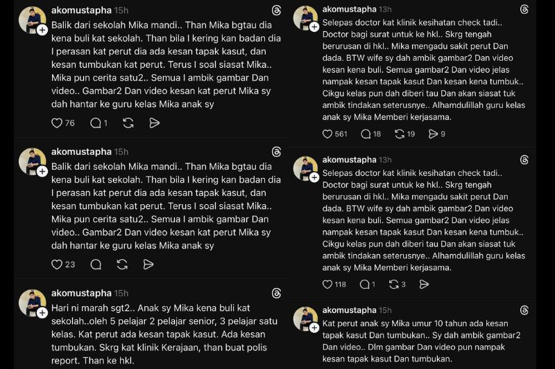 PELAKON Ako Mustapha mendakwa anaknya yang dikenali sebagai Mika menjadi mangsa buli di sekolah dalam satu kejadian yang berlaku pada Selasa.Ako atau Muhaizad Ahmad Mustapha, 55, berkata insiden itu hanya disedari selepas Mika pulang ke rumah. Menurut Ako, dia juga mendapati terdapat kesan tapak kasut dan tumbukan pada bahagian perut Mika.Pendedahan Ako yang dimuat naik di Threads miliknya."Hari ini (Selasa) rasa marah sangat, anak saya Mika kena buli di sekolah oleh lima orang pelajar. "Balik dari sekolah Mika mandi, dia beritahu kena buli di sekolah. "Bila saya keringkan badan dia perasan di perut ada kesan tapak kasut dan tumbukan. Saya terus soal siasat dan Mika pun cerita," katanya. ARTIKEL BERKAITAN: Anak menangis rindu... Ako Mustapha pilih kerja belakang tabir dapat lebih masa bersama keluargaARTIKEL BERKAITAN: Ako Mustapha hanya dengar cakap doktor pakar, isteri pula ‘pengawas’ pantau pemakanan Ako berkongsi perkara itu menerusi sebuah hantaran yang dimuat naik di Threads miliknya. Dalam pada itu, Ako memaklumkan dia sudah mengumpulkan bukti kejadian dan akan diserahkan kepada pihak sekolah untuk tindakan lanjut."Mika ada mengadu sakit perut dan dada. Isteri saya dah ambil gambar dan video kesan buli. "Semua gambar dan video dan diserahkan kepada guru kelas untuk siasat ambil tindakan seterusnya. Alhamdulillah guru beri kerjasama yang baik," ujarnya. Susulan kejadian itu, Ako segera membawa anaknya mendapatkan rawatan di klinik kesihatan sebelum dirujuk ke Hospital Kuala Lumpur (HKL) untuk pemeriksaan lanjut.Ako memaklumkan anaknya kini dirawat di hospital."Selepas doktor di klinik kesihatan buat pemeriksaan, dia bagi surat untuk ke HKL. "Sekarang anak saya masih lagi di HKL kena puasa sebab doktor nak buat pemeriksaan sinar X. "Doakan semuanya baik-baik buat anak saya," katanya.Jadilah sebahagian daripada geng mStar! Follow kami di Telegram, Twitter, TikTok, Facebook, Instagram dan YouTubeTONTON VIDEO PILIHAN!