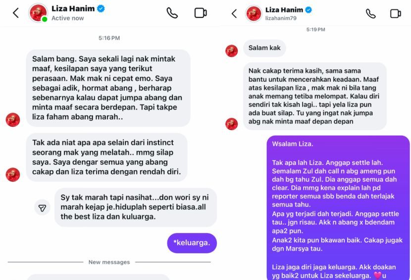 PENYANYI Liza Hanim membuat permohonan maaf secara peribadi kepada Ameng Spring susulan salah faham yang berlaku antara mereka.Menerusi hantaran mesej Liza, 46, kepada vokalis kumpulan Spring itu, dia mengakui terikut perasaan malah bersedia untuk bertemu bagi menjernihkan keadaan. "Saya sekali lagi nak minta maaf, kesilapan saya yang terikut perasaan. Mak mak ini cepat emosi. Liza memohon maaf kepada Ameng dan isterinya secara peribadi."Saya sebagai adik, hormat abang (panggilan Ameng) berharap sebenarnya kalau dapat jumpa abang dan minta maaf secara berdepan. Tapi tak apa Liza faham abang marah," katanya.Perkara itu dikongsikan isteri Ameng iaitu Sabariah Zakariah menerusi tangkap layar yang dimuat naik di Instagram.Kata Liza lagi, dia juga berlapang dada dengan segala nasihat yang diberikan Ameng kepadanya.ARTIKEL BERKAITAN: [V] Ameng cabar Liza Hanim buktikan kehebatan anak - “Dia nak tumpang glamor saya”ARTIKEL BERKAITAN: Liza Hanim sibuk kemas rumah, ramai tanya isu dengan Ameng"Tak ada niat apa-apa selain dari naluri seorang mak yang melatah. Memang silap saya. Saya dengar semua yang abang cakap dan Liza terima dengan rendah diri," luahnya.Sementara itu, Ameng atau Wan Aminuddin Wan Ismail, 57, juga menerima permohonan maaf itu dengan hati terbuka malah berharap mendoakan buat Liza dan keluarganya."Saya tak marah tapi nasihat, jangan risau saya ini marah sekejap saja. Hiduplah seperti biasa. Semoga berjaya Liza dan keluarga," balasnya. Malah Liza juga dilihat memohon maaf secara peribadi kepada isteri Ameng dan disambut dengan baik.Liza selesaikan kemelut dengan tenang.Sebelum ini, Liza Hanim menerusi laman Instagram meluahkan rasa terkilan selepas mendakwa seorang penyanyi senior memperlekehkan kemenangan anaknya dalam sebuah program realiti televisyen.Liza dalam satu temu bual bersama mStar bagaimanapun enggan mendedahkan individu yang dimaksudkan itu.Tidak lama selepas itu, Ameng pula tampil menyelar tindakan rakan seperjuangannya itu yang disifatkan cuba menangguk di air yang keruh.Meskipun penyanyi lagu Gelisah Mimpi itu tidak menyebut nama mana-mana pihak, namun Ameng berpandangan kenyataan yang dikeluarkan Liza itu dituju kepadanya dan merupakan satu cubaan untuk menumpang popularitinya.Jadilah sebahagian daripada geng mStar! Follow kami di Telegram, Twitter, TikTok, Facebook, Instagram dan YouTubeTONTON VIDEO PILIHAN!