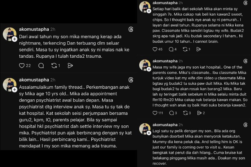 PELAKON Ako Mustapha berkongsi perkembangan terkini anaknya, Mika yang sebelum ini didakwa menjadi mangsa buli di sekolah. Ako atau Muhaizad Ahmad Mustapha, 55, berkata, Mika kini masih dalam pemantauan selepas mendapatkan rawatan daripada pakar psikiatri, yang mengesahkan anaknya mengalami trauma. Dia dalam masa sama memberitahu melihat perubahan pada anaknya itu dipercayai kesan akibat kes buli yang sudah lama berlarutan. "Dari awal tahun Mika memang kerap mimpi ngeri, terkencing dalam seluar. Masa itu saya ingatkan anak saya malas ke tandas. Rupanya itu tanda trauma. Ako berkongsi perkembangan Mika di Threads miliknya."Lagi satu saya pelik bila ada orang bunyikan loceng pintu, Mika akan menyorok ketakutan. Mummy (isteri) dia kena peluk dan beritahu tak mengapa hanya keluarga yang datang ke rumah"Kesan bengkak di perut sudah hilang, cuma lebam belakang pinggang Mika masih ada. Doakan anak saya cepat sembuh," katanya. Ako berkongsi perkara itu menerusi sebuah hantaran yang dimuat naik di Threads miliknya pada Ahad.Ako turut mendedahkan kejadian sebenar yang menimpa Mika terbongkar selepas seorang ibu bapa rakan sekelas anaknya datang melawat ketika Mika dirawat di hospital.ARTIKEL BERKAITAN: Ako Mustapha dakwa anak jadi mangsa buli di sekolah, kesan tapak kasut dan tumbukanARTIKEL BERKAITAN: Kes buli anak Ako Mustapha dapat perhatian menteriMenurutnya, ibu berkenaan menunjukkan video yang memaparkan beberapa murid dipercayai memaksa Mika memberikan wang."Masa isteri jaga Mika di hospital, salah seorang ibu bapa kawan anak saya datang melawat. Ibunya tunjuk video budak kelas beritahu budak-budak (suspek) suka minta duit Mika. "Kalau tak bagi, mereka akan rosakkan barang-barang milik Mika. Baru saya teringat sebelum ini Mika selalu minta RM10, RM20 cakap nak belanja kawan-kawan. "Saya ingatkan anak saya baik hati suka belanja kawan-kawan," ujarnya. Dari awal tahun Mika memang kerap mimpi ngeri, terkencing dalam seluar. Masa itu saya ingatkan anak saya malas ke tandas.AKO MUSTAPHAPELAKONMengulas lanjut, Ako mengakui sebelum ini dia menyangka anaknya sekadar bersikap pemurah terhadap rakan-rakan, tanpa menyedari perkara sebenar."Setiap hari balik dari sekolah Mika akan minta saya singgah kedai. Mika cakap nak belikan kawan-kawan gula-gula. "Saya layankan saja permintaan itu dari awal tahun. Rupanya selama ini Mika kena pau. Budak-budak sekarang apa nak jadi. "Kalau budak sekolah menengah saya faham, ini baru 10 tahun," katanya. Ako mahu menuntut pembelaan buat Mika.Sebelum ini, Ako menerusi hantaran dimuat naik di Threads memaklumkan kejadian itu membabitkan lima murid iaitu dua murid senior dan tiga rakan sekelas.Menurut Ako, kejadian yang menimpa Mikael atau mesra disapa Mika hanya disedari selepas anaknya itu pulang dari sekolah dan selesai mandi.Terdahulu, polis mengesahkan menerima laporan anak Ako yang didakwa menjadi mangsa buli di sekolahnya di Wangsa Maju.Ketua Polis Daerah Wangsa Maju, Asisten Komisioner Annas Sulaiman dilapor berkata, pihaknya mengesahkan menerima laporan polis berhubung kejadian itu.Jadilah sebahagian daripada geng mStar! Follow kami di Telegram, Twitter, TikTok, Facebook, Instagram dan YouTubeTONTON VIDEO PILIHAN!