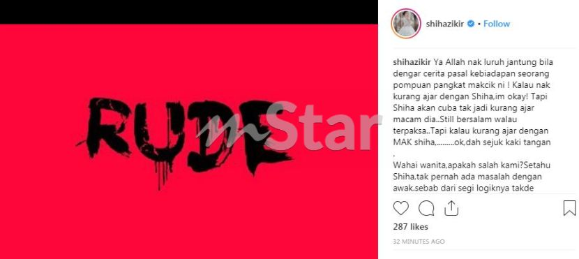 "Lain kali kalau terjumpa, bagi tau apa yang tak puas hati sangat? Setahu Shiha, awak yang kurang ajar bukan Shiha dan sepatutnya Shiha yang perlu bersikap macam tu dengan orang yang kurang ajar macam awak, tapi Shiha tak macam tu," katanya.