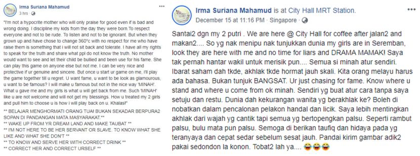 Menerusi entri terbaharu Irma, dia menjelaskan sebagai ibu dia mempunyai hak untuk bercakap tentang kebenaran dan berkongsi perkara yang masyarakat tidak tahu.