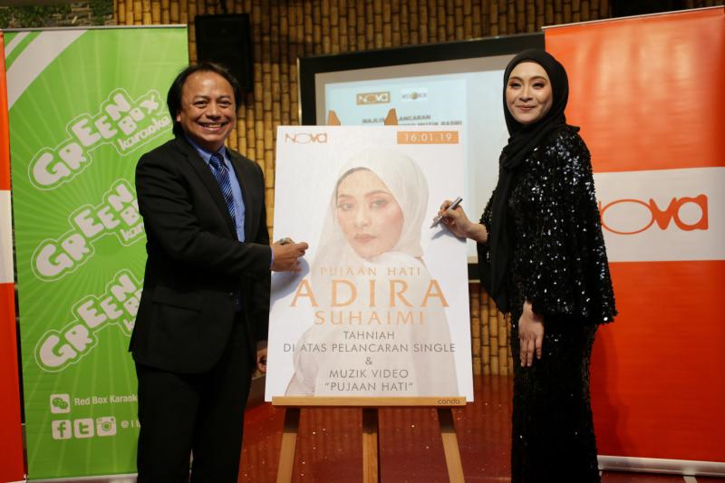Adira bersama pihak pengarah urusan Nova Muzik, Rosmin Hashim ketika pelancaran video muzik lagu Pujaan Hati.