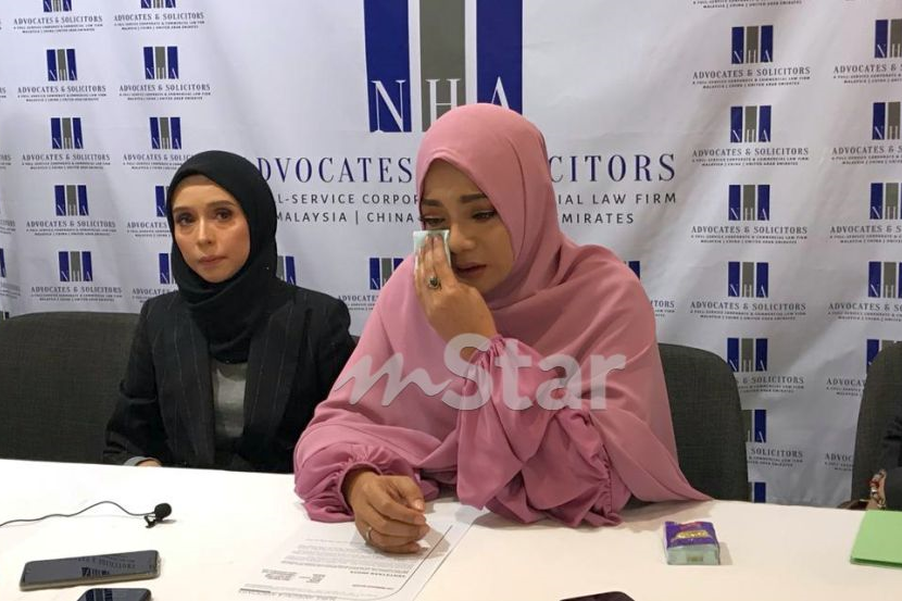 Linda Rafar (kanan)tidak dapat menahan sebak apabila menceritakan bagaimana dia dikutuk di media sosial berhubung 'postingnya' mengenai jururawat. Turut kelihatan peguamnya iaitu Nurul Hafidzah.