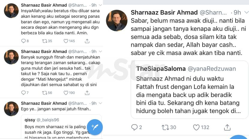 Sharnaaz menerusi laman Twitter membalas beberapa komen yang dianggap keterlaluan dan menimbulkan fitnah mengenai rumah tangganya.
