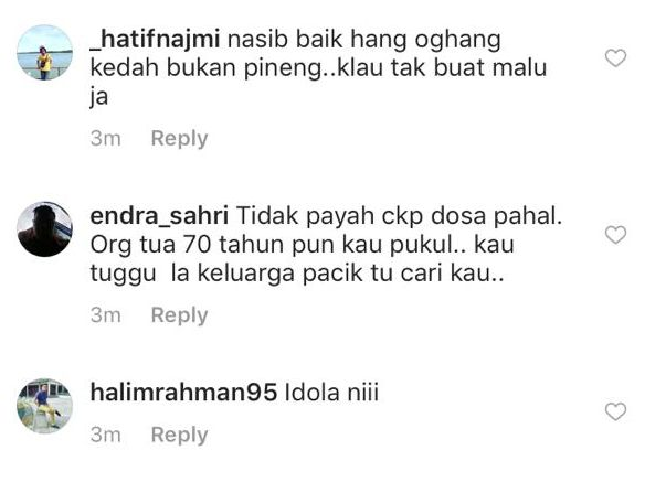 “Semoga Allah ampunkan dosa. Kami orang Kedah kecewa. Bahasa kasar, kami boleh terima... tapi buat orang tua macam tu kami tak boleh bang. Tak payah pergi jauh kalau mak ayah kita orang buat macam tu, tak marah?" tulis @cik_adinda9.