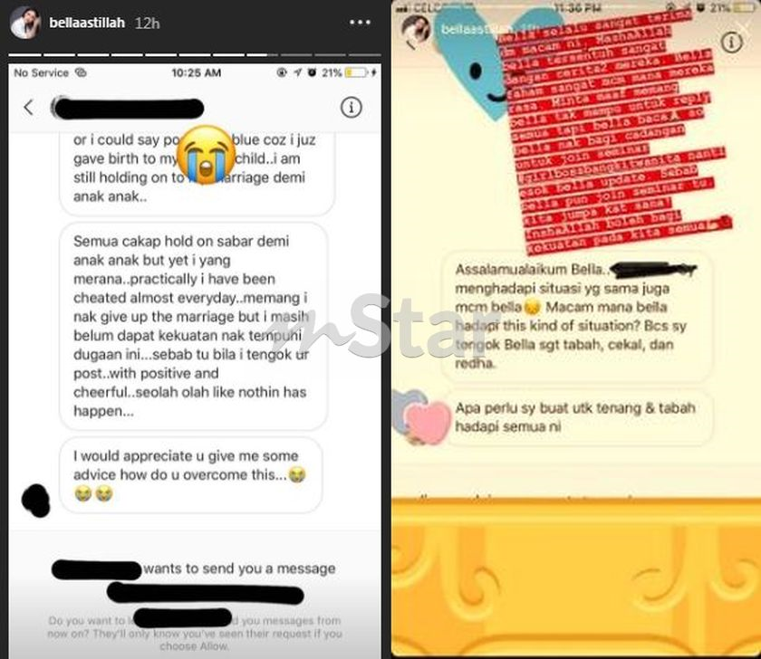 Bella memuat naik paparan skin mesej peribadi daripada beberapa wanita yang berkongsi nasib dengannya.