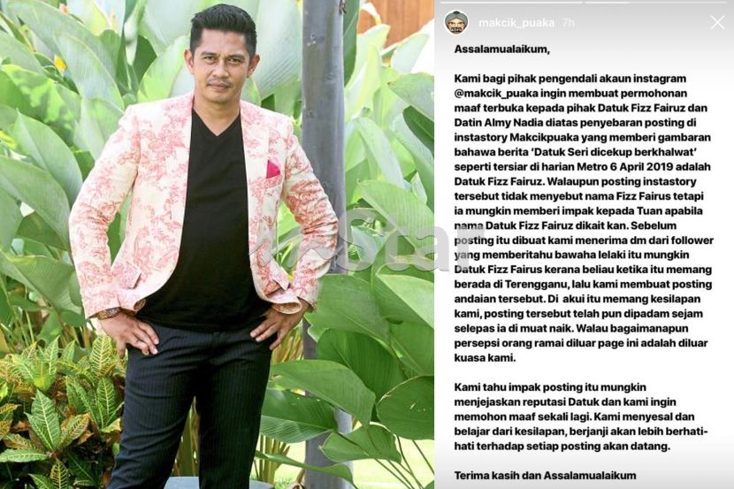 SEBUAH akaun instagram yang menyebarkan berita panas dan gosip aktis iitu Makcik Puaka tampil membuat permohanan maaf secara terbuka selepas menyebarkan berita berunsur fitnah terhadap pelakon Datuk Fizz Fairuz dan isteri, Datin Almy Nadia. Menerusi sebuat posting akaun tersebut mengenai seorang individu bergelar Datuk Seri dicekup khalwat tidak ada menyebut nama pelakon berkenaan, namun akaun tersebut seakan memberi gambaran individu berkenaan merupkan Fizz Fairuz. Pihak akaun tersebut mengakui telah membuat andaian tersebut selepas menerima mesej di Instagram daripada pengikutnya yang berada di Terangganu ketika kejadian itu berlaku. ARTIKEL BERKAITAN: “Lebih baik bunuh saja suami saya” – Almy Nadia nafi Fizz Fairuz ditangkap khalwat ARTIKEL BERKAITAN: “Netizen sekarang ni dah gila” - Almy Nadia tak tahu Fizz Fairuz nak saman siapa Akaun IG tersebut membuat permohonan maaf selepas menyebarkan berita berunsur fitnah terhadap Fizz. "Assalammulaikum, kami bagi pihak pengendali akaun instagram @makcik_puaka ingin membuat permohanan maaf terbuka kepada pihak Datuk Fizz Fairuz dan Datin Almy Nadia diatas penyebaran posting di instastory MakcikPuaka yang memberi gambaran bahawa berita 'Datuk Seri dicekup berkhalwat' seperti tersiar di Harian Metro 6 April adalah Datuk Fizz. "Walaupun posting instastory tersebut tidak menyebut nama Fizz Fairuz tetapi ia mungkin memberi impak kepada Tuan apabila nama Datuk Fizz Fairuz dikaitkan. "Sebelum posting dibuat kami menerima dm dari pengikut yang memberitahu bahawa lelaki itu mungkin Datuk Fizz Fairuz kerana beliau ketika itu memang berada di Terengganu, lalu kami membuat posting andaian tersebut," katanya. Pengendali akaun tersebut telah mengeluarkan kenyataan permohanan maaf di laman Instastory selepas Fizz memberi amaran dan ingin mengambil tindakan saman terhadapnya. Sebelum ini, Fizz, 40, kesal dengan fitnah tidak berasas disebarkan selepas seorang lelaki bergelar Datuk Seri ditangkap khalwat bersama pasangannya di Pulau Perhentian, baru-baru ini. Almy turut terkejut dengan penyebaran fitnah terhadap suaminya. Disebabkan perkara tersebut, Fizz memberi tempoh satu minggu kepada pihak yang menabur fitnah untuk membuat permohonan maaf secara terbuka. Dalam pada itu, akaun IG tersebut juga memberitahu mereka tiada kuasa untuk menghalang persepsi orang luar mengenai perkara itu. Bagaimanapun, pihak mereka mengakui penyebaran itu telah menjejaskan reputasi pelakon tersebut dan akan lebih berhati-hati memuat naik sesuatu selepas ini. "Walau bagaimanapun persepsi orang ramai diluar page ini adalah diluar kuasa kami. Kami tahu impak posting itu mungkin menjejaskan reputasi Datuk dan kami ingin memohon maaf sekali lagi. "Kami menyesal dan belajar dari kesilapan, berjanji akan lebih berhati-hati terhadap setiap posting akan datang," ujarnya.