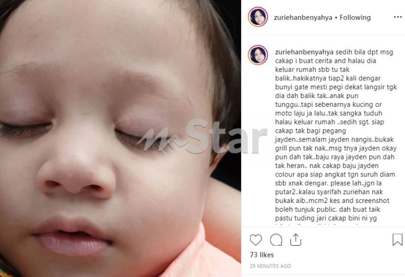 "Tak mengaku sampailah ada bukti. Kali ini bini orang anak tiga. Semoga Allah lindungi Jayden dan saya," tulis Zuriehan.