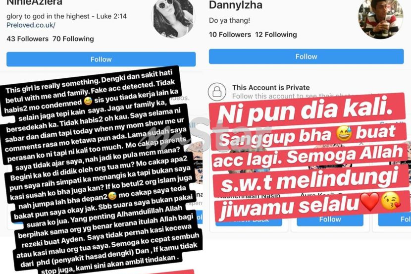 "This girl is really something. Dengki dan sakit hati betul dengan saya dan keluarga, akaun palsu dikesan. Tidak habis-habis mahu condemned, sis you tiada kerja lain ke selain jaga tepi kain saya. Jaga your family ke, bersedekah ke, tak habis-habis.