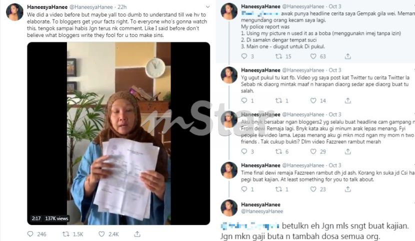"Dua akaun lagi di laman sosial Haneesya. Akaun itu mengambil gambar tanpa izin untuk mengaibkan Haneesya. Lagi satu, individu ini mengaitkan Hajarul Aswad dan menghina tempat tinggal kami.