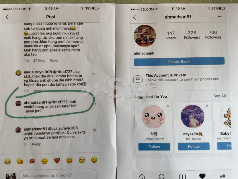 "Laporan dibuat terhadap seorang individu menggunakan akaun Instagram @ahmadsan81 yang menghina dan memfitnah mengenai taraf anak saya. Ia keterlaluan dan melampau!