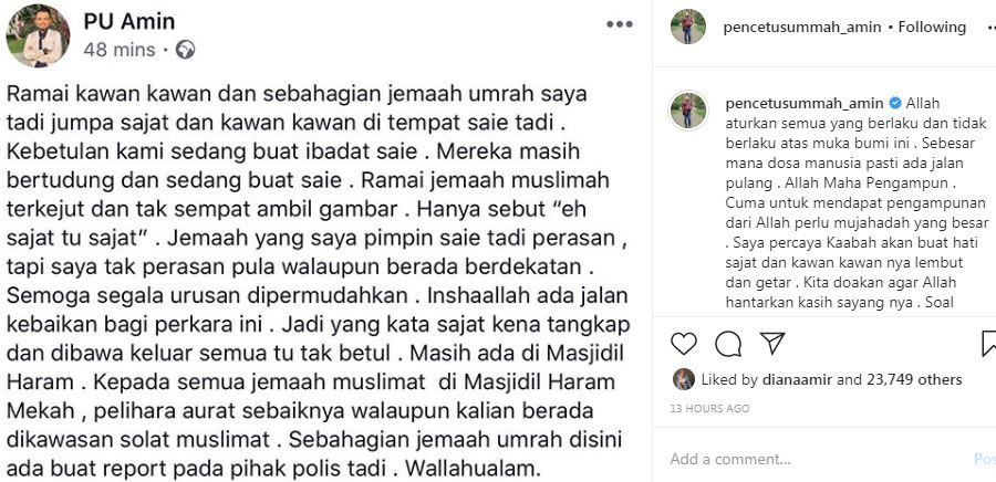 Bagaimanapun, pendakwah bebas dan mutawif Pencetus Ummah (PU) Amin memberitahu beberapa jemaah dan kawan-kawannya masih terserempak dengan selebriti laman sosial itu ketika membuat saie.
