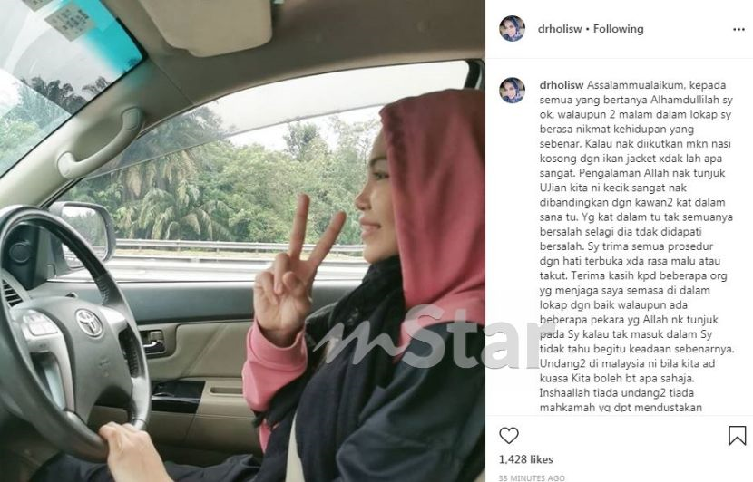 "Terima kasih kepada beberapa orang yang menjaga saya semasa di dalam lokap dengan baik walaupun ada beberapa perkara yang Allah nak tunjuk pada saya. Kalau tak masuk dalam saya tidak tahu begitu keadaan sebenarnya.