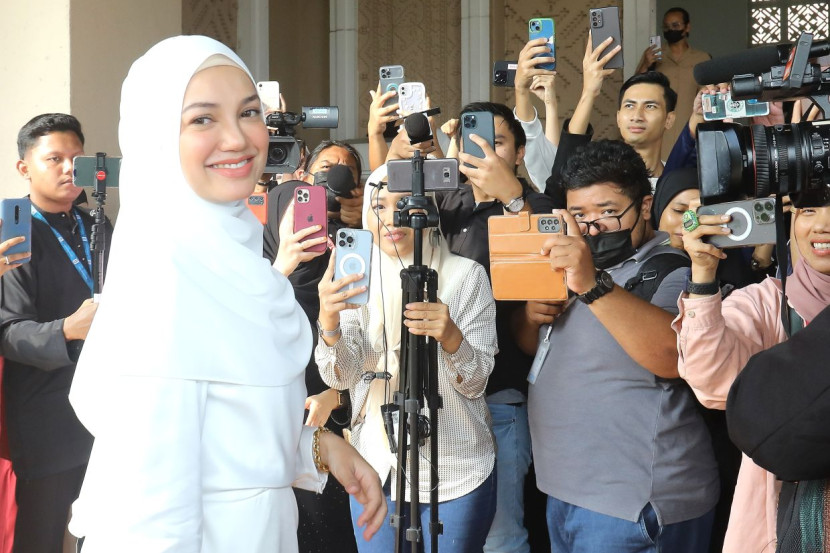 PELAKON Puteri Sarah Liyana tiba di Mahkamah Rendah Syariah Wilayah Persekutuan sekitar pukul 9 pagi Selasa dalam keadaan ceria dalam persalinan jubah berwarna putih.