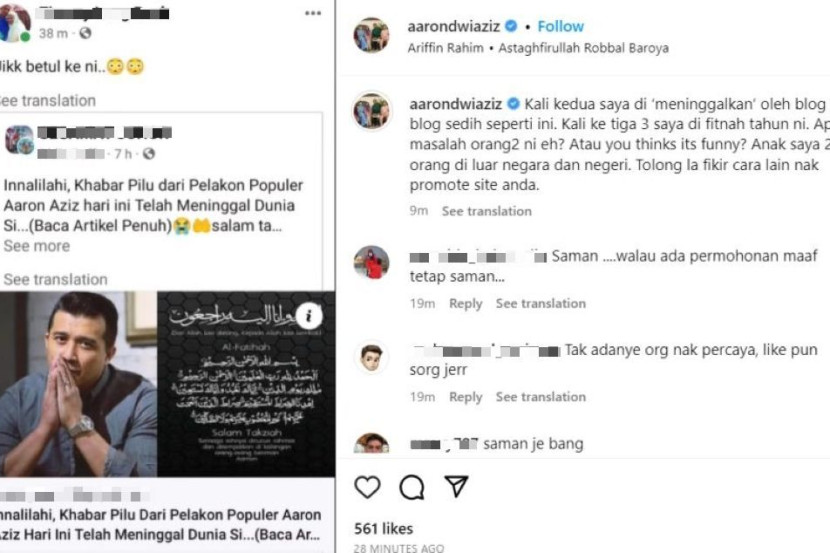 PELAKON Datuk Aaron Aziz meluahkan rasa terkilan apabila membaca berita yang melaporkan dia sudah meninggal dunia pada Sabtu. Aaron atau Aaron Mustapha Aziz, 47, berkata, ini bukan kali pertama berita mengenai dia sudah meninggal dunia tersebar. "Kali kedua saya di ‘meninggalkan’ oleh blog-blog sedih seperti ini. Kali ketiga saya di fitnah tahun ni," katanya. Aaron berkongsi mengenai perkara itu menerusi hantaran dimuat naik di Instagram miliknya pada petang Sabtu. Azzron meluahkan perasaan geram apabila ada lagi berita palsu mengenai kematiannya. Menerusi hantaran berkenaan, Aaron turut memuat naik keratan foto dari portal yang menyebarkan berita kematiannya dengan tajuk 'Innalilahi, khabar pilu dari pelakon popular Aaron Aziz hari ini telah meninggal dunia'. Dalam pada itu, Aaron beranggapan perbuatan tersebut sebagai tidak kelakar walaupun sekadar mempromosikan iklannya memandangkan dia memiliki dua orang anak yang tinggal di luar negara. ARTIKEL BERKAITAN: [V] Sudah berusia, faktor badan, kesihatan dan pandangan aktor lain antara sebab Aaron Aziz terpaksa digugurkan dalam Original Gangster ARTIKEL BERKAITAN: Aaron Aziz pun pernah kena tipu, harap ‘scammer’ kena blacklist seumur hidup Ia boleh mendatangkan kebimbangan kepada mereka sekiranya membaca laporan tersebut. "Apa masalah orang-orang ini eh? Atau awak rasa ini kelakar? "Anak saya dua orang di luar negara dan negeri. Tolong la fikir cara lain nak promosian iklan anda," kongsinya. Sementara itu, usaha mStar untuk mendapatkan maklum balas daripada Aaron bagaimanapun tidak berjaya apabila panggilan dan hantaran WhatsApp tidak dijawab. Jadilah sebahagian daripada geng mStar! Follow kami di Telegram, Twitter, TikTok, Facebook, Instagram dan YouTube TONTON VIDEO PILIHAN!