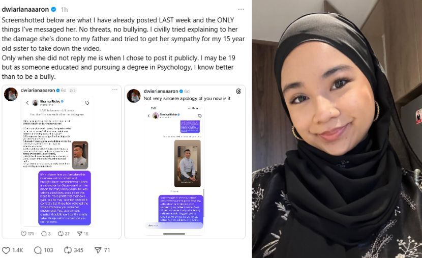 ANAK kepada pelakon Datuk Aaron Aziz iaitu Dwi Ariana tampil membela diri susulan tindakan pempengaruh media sosial, Sharina Richie, yang mahu menyamannya sebanyak RM2 juta.