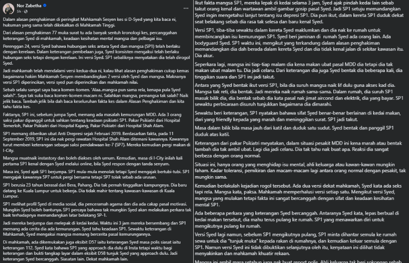 KEPUTUSAN mahkamah dalam kes rogol membabitkan pendakwah selebriti Da’i Syed dibuat selepas penelitian menyeluruh terhadap keterangan kedua-dua pihak, termasuk mengambil kira keadaan kesihatan mental mangsa.Seorang peguam bernama Nor Zabetha berkongsi pengetahuan atas kapasitinya sebagai pengamal undang-undang bahawa alasan penghakiman Mahkamah Sesyen jelas memperincikan versi kejadian yang dikemukakan oleh tertuduh dan mangsa sebelum membuat keputusan mensabitkan Syed atas pertuduhan rogol, sekali gus menolak dakwaan sesetengah pihak yang menyifatkan mangsa kononnya ‘sama rela’. Menurut Nor Zabetha, keterangan dalam penghakiman Mahkamah Sesyen menyatakan bahawa mangsa, yang menghidap kemurungan Major Depressive Disorder (MDD), berkenalan dengan Syed melalui Instagram dan bersetuju untuk bertemu. Nor Zabetha sifatkan alasan penghakiman kes Syed di mahkamah jelas.Pertemuan dikatakan berlaku di sebuah kedai makan sebelum berlarutan mangsa di bawa pulang ke rumah. Sebaik tiba di rumah Syed, tekanan mula timbul dari lif apabila tertuduh dikatakan meninggi suara kepada mangsa dan menunjukkan sikap tegas serta menakutkan. Tekanan berterusan di dalam bilik sehingga mangsa hanya duduk jauh dari katil kerana takut, sebelum berlaku kejadian dakwaan rogol. Menurut peguam itu, perlakuan tertuduh amat berbeza ketika di kedai makan dan semasa berada di rumah. “Kalau lihat alasan penghakiman, mahkamah mendalami kedua-dua versi. Versi Saksi Pendakwaan 1 (SP1) diperincikan, versi Syed juga diperincikan dan kemudian mahkamah membuat penilaian.ARTIKEL BERKAITAN: [V] Da’i Syed menangis, gagal rayuan… Hukuman penjara dan sebat kekalARTIKEL BERKAITAN: Da’i Syed kekal bersalah kerana rogol, peguam fail rayuan…. Mohon tangguh hukuman kerana isteri baru bersalin“Saya sering membaca komen yang mengatakan mangsa sama rela dan mempersoalkan mengapa Syed pula dipersalahkan. "Saya sangat tidak setuju dengan naratif sebegitu kerana ia menyalahkan mangsa dan mengabaikan perbuatan pemangsa,” katanya.Nor Zabetha berkongsi pandangan itu menerusi hantaran di Facebook miliknya pada pagi Ahad.Untuk info, SP1 berusia 23 tahun berasal dari Bera, Pahang dan merupakan anak kepada seorang penoreh getah.Jelas Nor Zabetha, dakwaan bahawa mangsa merelakan perbuatan tersebut adalah tidak berasas dan bercanggah dengan keseluruhan fakta kes yang dibentangkan di mahkamah.Tambah peguam itu, laporan serta keterangan pakar psikiatri yang dikemukakan dalam perbicaraan turut menyokong kredibiliti mangsa, selain keterangan SP1 yang konsisten dan disokong bukti lain. Pemangsa boleh ‘move on’, tetapi mangsa menanggung kesakitan itu untuk jangka masa panjang.NOR ZABETHA PEGUAM“Dalam banyak kes jenayah seksual, mangsa sukar melepaskan apa yang berlaku. Mereka mahukan pengakuan bahawa apa yang dilakukan terhadap mereka adalah salah. "Pemangsa boleh ‘move on’, tetapi mangsa menanggung kesakitan itu untuk jangka masa panjang.“Mahkamah juga mengambil maklum keadaan mental mangsa yang pada masa sama terpaksa melalui proses siasatan, pemeriksaan alat sulit, memberi keterangan, menjalani kawad cam dan mengimbau semula kejadian traumatik di mahkamah. Itu bukan sesuatu yang mudah,” ujarnya.Mengulas lanjut, kata Nor Zabetha, isu ketidakseimbangan ruang antara mangsa dan tertuduh ketika kes dibicarakan di khalayak, khususnya melalui media sosial, perlu diberi perhatian. Malah dia turut mempersoalkan sikap segelintir pihak yang masih mempertahankan Syed dengan menjadikan latar belakang pendidikannya sebagai alasan.Antara ulasan Nor Zabetha di Facebook miliknya."Mangsa tiada ruang untuk menjelaskan apa yang berlaku. Hingga hari ini, mangsa masih bergelut dengan trauma, ditambah pula dengan komen orang ramai yang terus menyalahkannya. "Dalam alasan penghakiman, mahkamah ada memetik latar belakang Syed daripada sekolah rendah, pengajian di Mesir serta penglibatannya sebagai penceramah agama. "Sepatutnya, dengan ilmu agama yang tinggi, batas itu lebih difahami. Syed sendiri mengaku di mahkamah melakukan hubungan seks luar nikah, namun masih ada pihak yang mengangkatnya sebagai suci dan mendakwa mangsa memfitnah,” jelasnya.Untuk rekod, pada 10 Disember 2020, Syed Shah Iqmal Syed Mohd Shaiful, lebih dikenali sebagai Da’i Syed, mengaku tidak bersalah atas pertuduhan merogol seorang wanita berusia 23 tahun di sebuah kondominium di I-City, Shah Alam, pada 11 September 2019.Syed dibawa ke penjara Kajang sejak Jumaat lalu.Tertuduh didakwa mengikut Seksyen 376(1) Kanun Keseksaan yang memperuntukkan hukuman penjara maksimum 20 tahun dan sebatan. Pada 30 Ogos tahun lalu, Mahkamah Sesyen menetapkan hukuman penjara 10 tahun dan tiga sebatan, namun Syed dibebaskan dengan jaminan bermula 20 September 2024 menunggu keputusan rayuan. Keputusan Mahkamah Tinggi pada Jumaat lalu mengekalkan sabitan dan hukuman tersebut, dengan hakim menegaskan dapatan Mahkamah Sesyen dibuat berdasarkan bukti kukuh serta penilaian menyeluruh. Permohonan penangguhan hukuman Syed ditolak mahkamah dan hukuman penjara berkuat kuasa serta-merta.Jadilah sebahagian daripada geng mStar! Follow kami di Telegram, Twitter, TikTok, Facebook, Instagram dan YouTube