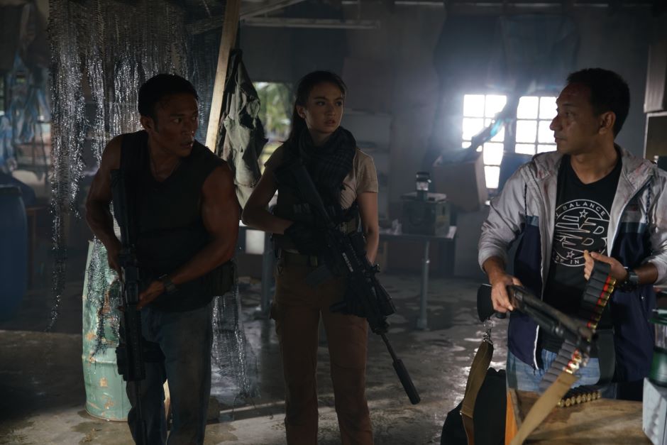 Khai (Shaheizy Sam), Rian (Raline Shah) dan Sani (Zizan Razak) dalam salah satu babak filem Polis Evo 2.