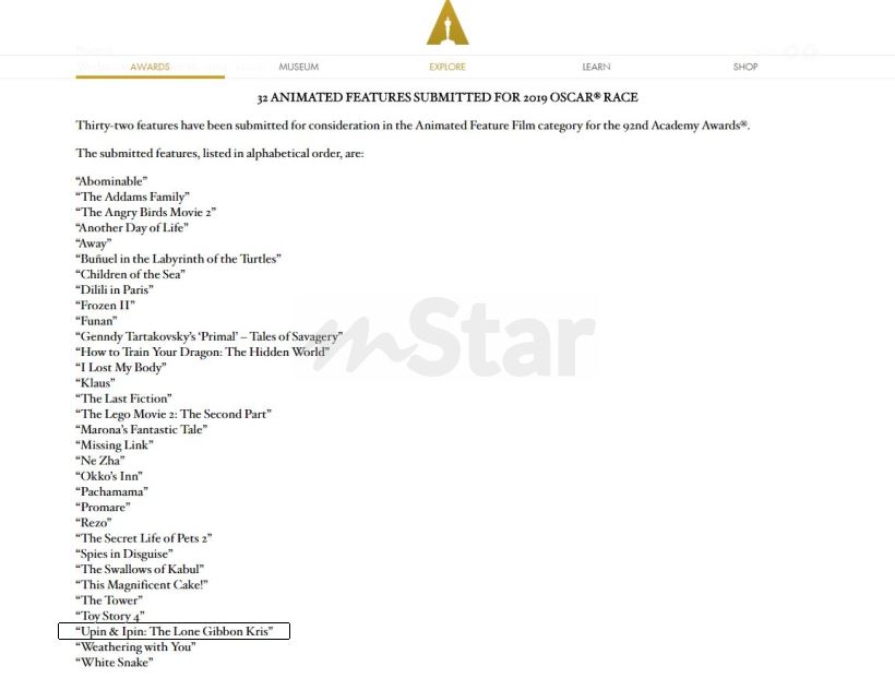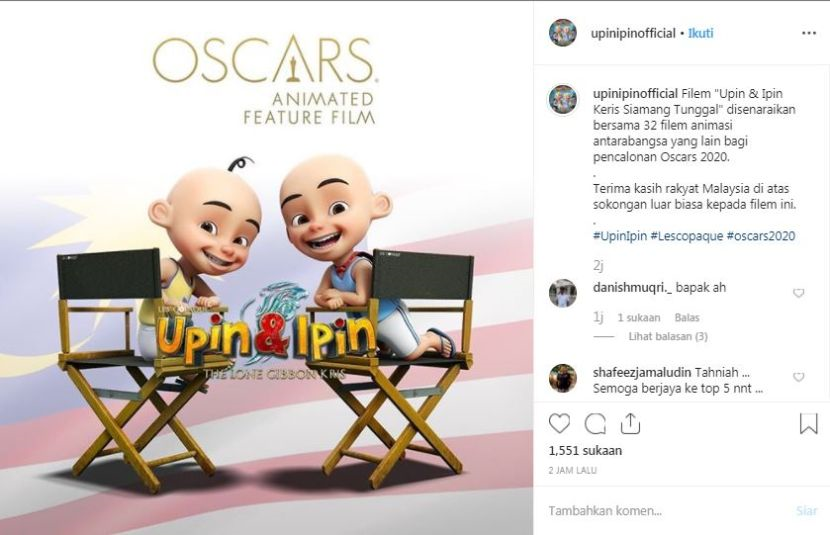 "Filem Upin & Ipin Keris Siamang Tunggal disenaraikan bersama 32 filem animasi antarabangsa yang lain bagi pencalonan Oscars 2020.