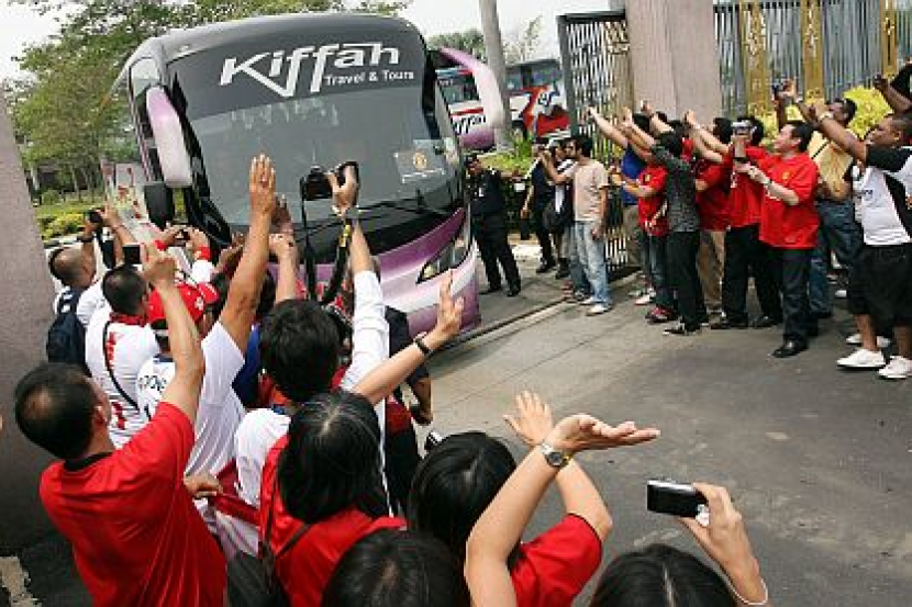 Ratusan peminat MU berkumpul di hadapan Kompleks Bunga Raya, KLIA bagi melihat pemain-pemain kegemaran mereka yang diketuai oleh pengurus pasukan, Sir Alex Ferguson.
