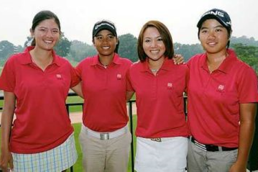 Empat pemain golf wanita (dari kiri) Tanaporn Kongkiatkrai, Ainil Johani Abu Bakar, Porani Chutichai dan Aretha Pan meraikan kejayaan mereka selepas beraksi pada sesi kelayakan bagi kejohanan LPGA Sime Darby Malaysia baru-baru ini.