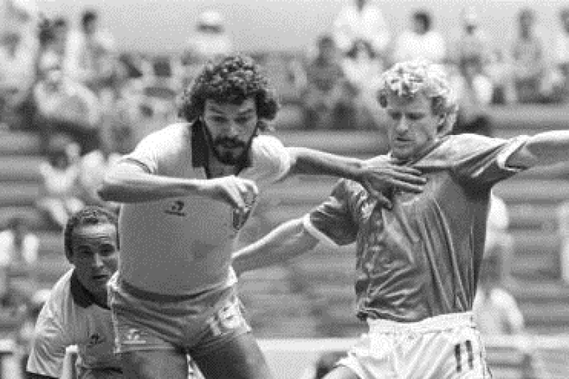 Socrates (kiri) di era kegemilangannya ketika pertemuan menentang Ireland pada Piala Dunia 1986 di Guadalajara.