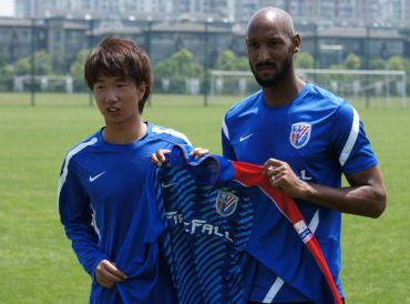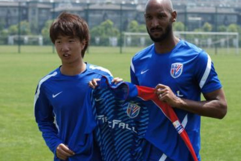 Sheang Tsung (kiri) bergambar bersama pemain-jurulatih kelab Shenhua Shangai, Nicolas Anelka sambil memegang jersey bernombor 18 selepas menjalani sesi latihan pertama sebagai pemain rasmi dengan kelab itu di Kangqiao, Shanghai. Foto oleh CHOW HOW BAN