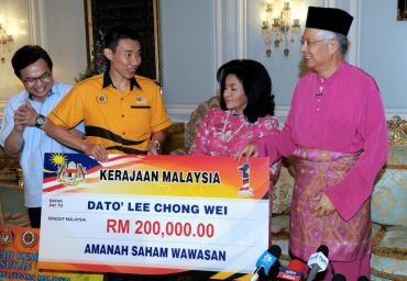 Najib bersama isterinya bertemu dengan Chong Wei yang memenangi Pingat Perak di Sukan Olimpik London 2012 di Seri Perdana, Ahad.PUTRAJAYA: Jaguh badminton negara Datuk Lee Chong Wei menerima ganjaran RM500,000 di atas kejayaannya meraih pingat perak dalam acara perseorangan badminton sukan Olimpik London 2012, Ahad.Ganjaran itu disampaikan Perdana Menteri Datuk Seri Najib Tun Abdul Razak dalam majlis di Seri Perdana di sini yang turut dihadiri isteri Perdana Menteri Datin Seri Rosmah Mansor. Ganjaran meliputi RM300,000 sumbangan Skim Hadiah Kemenangan Sukan, Majlis Sukan Negara dan RM200,000 sumbangan kerajaan Malaysia dalam bentuk Amanah Saham Wawasan.Selain itu, Chong Wei turut menerima hadiah seutas jam tangan yang disampaikan Rosmah, selaku penaung Persatuan Badminton Malaysia (BAM).Dalam ucapan ringkasnya, Perdana Menteri mengucapkan tahniah di atas kejayaan jaguh badminton negara itu meraih pingat perak dan yakin ia akan menguatkan lagi azam Chong Wei untuk mencipta kejayaan lebih cemerlang di Olimpik 2016."Mungkin kali ini nasib tidak menyebelahi beliau (Chong Wei) untuk meraih emas tetapi beliau sudah berhempas pulas dan berjuang habis-habisan."Itu sudah menunjukkan betapa besar jiwanya untuk mencapai kejayaan dan diharapkan tidak putus asa untuk mencipta kejayaan yang lebih membanggakan," katanya.Pada majlis itu, Najib turut menyatakan persetujuan mengenai cadangan mewujudkan Akademi Badminton Negara di Pusat Latihan Badminton Stadium Juara Bukit Kiara.Satu majlis sama dijadual diadakan selepas Aidilfitri bagi menghargai pencapaian pingat gangsa oleh ratu terjun negara Pandelela Rinong dalam acara 10m platform individu wanita.Sementara itu, Chong Wei, 30, berkata beliau akan mempertimbangkan hasrat Perdana Menteri untuk melihat beliau kembali merebut pingat emas pertama pada temasya Olimpik Rio de Janeiro, Brazil 2016."Terima kasih kepada Perdana Menteri dan isteri atas ganjaran ini, saya akan simpan duit itu. Walaupun tidak dapat membawa balik pingat emas, kerajaan masih memberi sokongan kepada saya. Bagaimanapun saya telah buat yang terbaik," katanya.Chong Wei berharap dengan sokongan tersebut, ia akan menyuntik semangat untuk dirinya meneruskan aksi di sukan Olimpik akan datang, sebagaimana yang dihasratkan Perdana Menteri."Bagaimanapun saya perlu lihat prestasi saya dua tahun lagi iaitu selepas Sukan Asia di Incheon, Korea Selatan dan Sukan Komanwel di Glasgow, Scotland, kedua-duanya pada 2014. Jika masih 'fit'(cukup cergas) saya akan teruskan pada Olimpik 2016," katanya.-BERNAMA