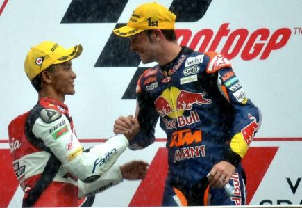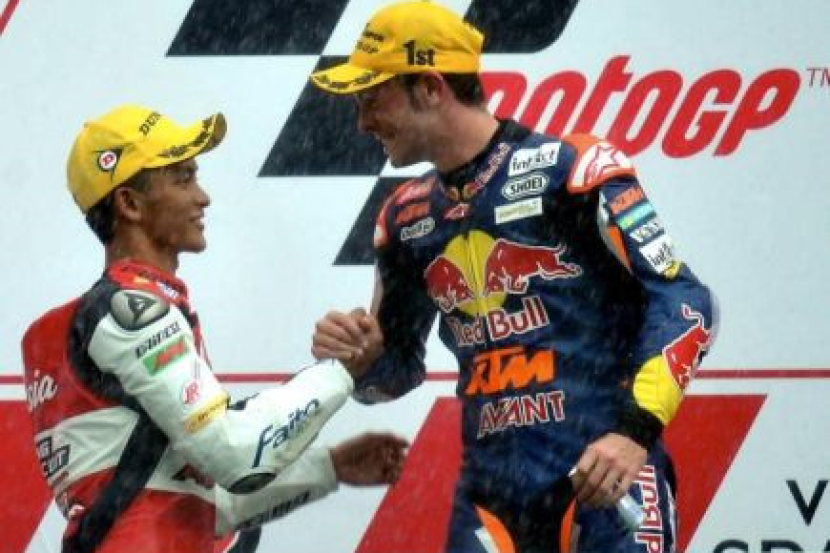 Pelumba Airasia SIC-Ajo/KTM, Zulfahmi Khairuddin (kiri) bersalaman dengan pemenang tempat pertama pelumba Red Bull KTM Ajo, Sandro Cortese (kanan) selepas berjaya menduduki tempat kedua pada saingan Grand Prix Motosikal Malaysia 2012 (MotoGP 2012) di Litar Antarabangsa Sepang di sini, Ahad. Zulfahmi menduduki tempat kedua dengan catatan masa 40'54.123. --fotoBERNAMASEPANG: Pelumba Jerman Sandro Cortese dari pasukan Red Bull KTM Ajo merangkul kejuaraan Moto3 selepas mencatatkan masa terpantas 40 minit 54.123 dalam perlumbaan 18 pusingan Grand Prix Motosikal Malaysia.Di tempat kedua ialah pelumba Malaysia Zulfahmi Khairuddin dari pasukan AirAsia-SIC-Ajo dengan masa 40'54.151s, manakala penunggang Jerman Jonas Folger dari Mapfre Aspar Team Moto3 di tempat ketiga dengan masa 40'54.370s. -BERNAMA