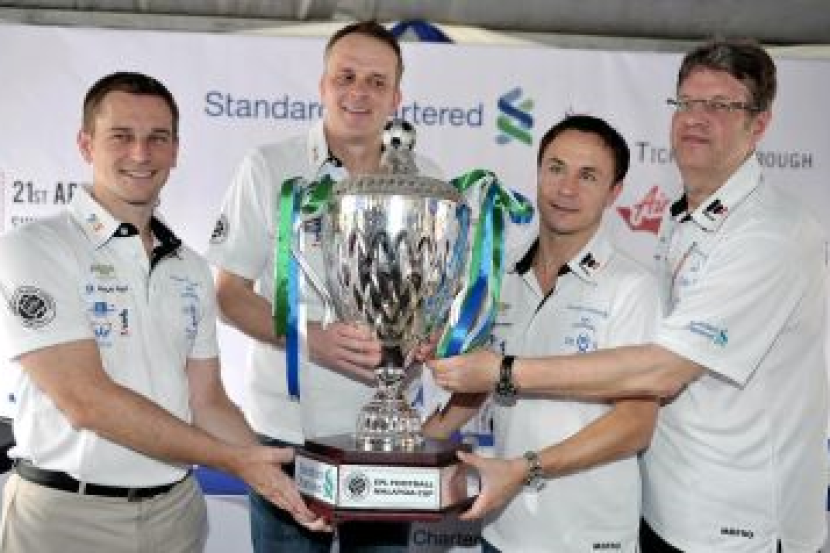 Wise (dua, kanan) dan bintang Liverpool Dietman Hamann (dua, kiri) bergambar bersama piala selepas sidang media mengenai pelancaran The Standard Chartered EPL Football Cup 2013
