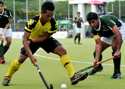 Pemain Malaysia Faizal Saari mengawal bola sambil dihalang pemain Pakistan Muhammad Imran pada Kejohanan Separuh Akhir Liga Hoki Dunia di Stadium Hoki Taman Daya di Johor Bharu pada Sabtu. Malaysia menewaskan Pakistan dengan 3-1. -Foto BERNAMA JOHOR BAHARU: Malaysia mengalahkan Pakistan 3-1 pada perlawanan penentuan tempat kelima hingga kelapan pada pusingan separuh akhir Kejohanan Liga Hoki Dunia di sini, Sabtu.Separuh Masa: Malaysia 2-1 Penjaring:Malaysia: Muhammad Razie Abd Rahim (14'), Imran Khan (gol sendiri-19') Tengku Ahmad Tajudin Abd Jalil (38')Pakistan: Shafqat Rasool (16')-BERNAMA