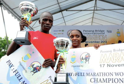 KENYA JUARA … James C Tallam (kiri) dan Naomi Wambul Muriuki menjadi juara terbuka lelaki dan wanita bagi kategori terbuka larian penuh Marathon Antarabangsa Jambatan Pulau Pinang, Ahad. Seramai 47,000 peserta mengambil bahagian dalam larian marathon tersebut yang dianjurkan oleh kerajaan negeri. -fotoBERNAMA