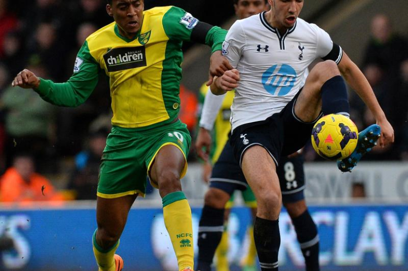 Pemain Norwich City, Leroy Fer (kiri) cuba merampas bola daripada Pemain Tottenham Hotspur, Nabil Bentaleb (kanan) pada perlawanan Liga Perdana Inggeris antara Norwich City dan Tottenham Hotspur di Carrow Road di Norwich, England. Foto AFP