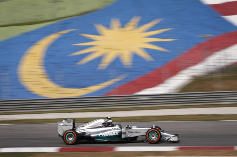 SEPANG: Pelumba Mercedes, Lewis Hamilton mendahului barisan pelumba pada sesi latihan bebas pertama Grand Prix Formula Satu (F1) Petronas Malaysia 2014, pagi Jumaat.