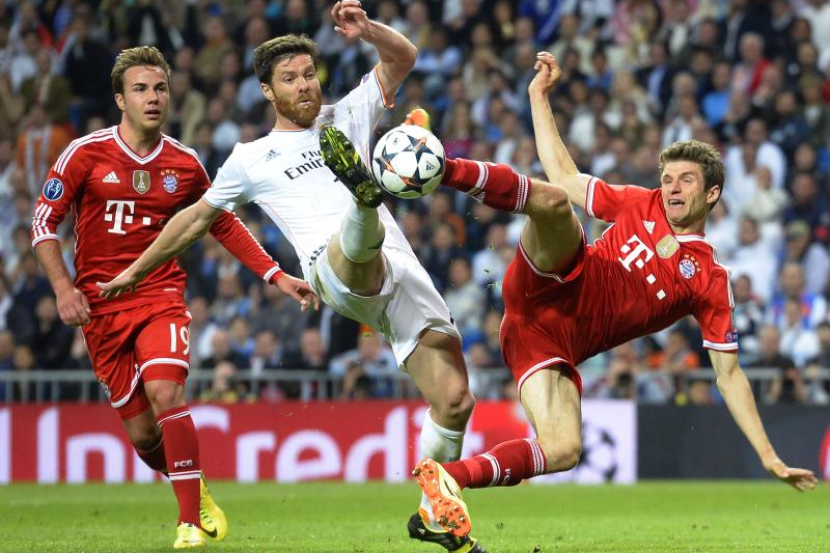 Pemain Real Madrid, Xabi Alonso (tengah) bersaing dengan pemain tengah Bayern Munich, Mario Goetze (kiri) Thomas Mueller pada aksi perlawanan Liga Jura-Juara di Stadium Santiago Bernabeu, Madrid.