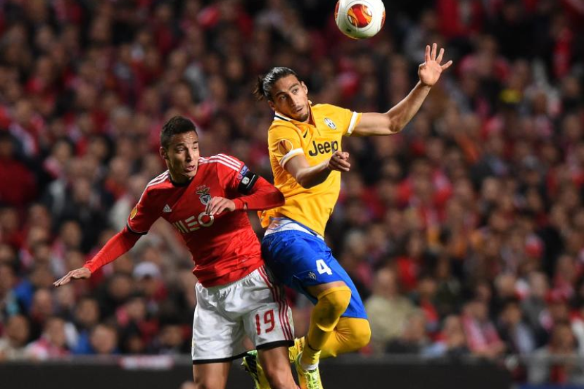 Pemain Benfica, Rodrigo Machado (kiri) bersaing dengan pemain pertahanan Juventus, Martin Caceres pada aksi perlawanan Liga Europa di Stadium Luz di Lisbon.