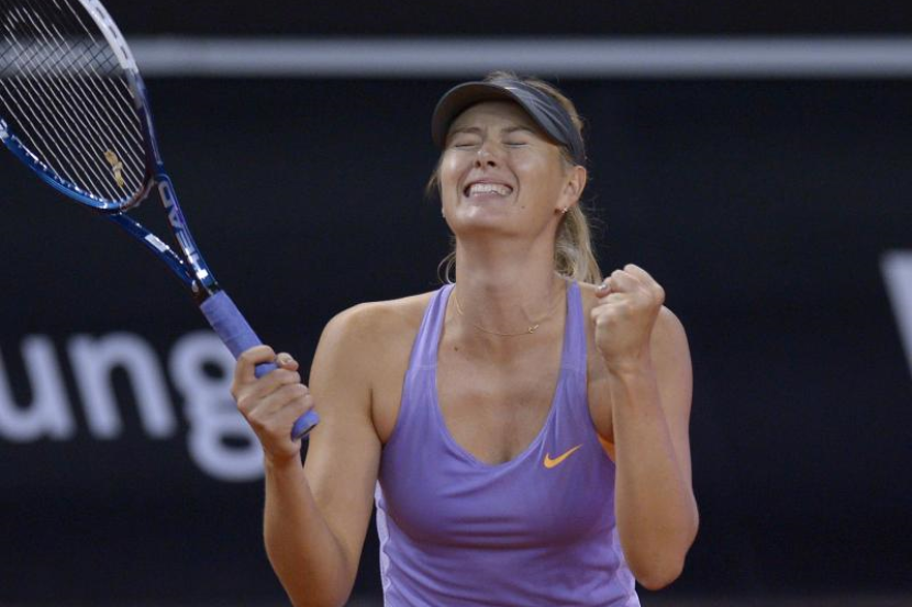 Pemain Rusia, Maria Sharapova meraikan kemenangannya menewaskan pemain Serbia Ana Ivanovic dalam perlawanan akhir WTA Porsche Tennis Grand Prix di Stuttgart, Jerman pada Ahad. Sharapova menang 3-6,6-4,6-1. - Foto AFP.