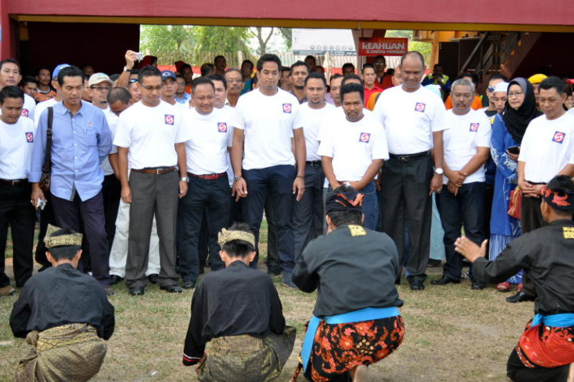 Khairy Jamaluddin Abu Bakar (berdiri, tengah) disambut oleh para pesilat Pergerakan Pemuda Umno Besut ketika hadir pada pelancaran Program Jambori Orang Muda (JOM) anjuran Pejabat dan Majlis Belia Daerah serta Pergerakan Pemuda Umno Besut di Stadium Mini Kampung Raja pada Jumaat.
