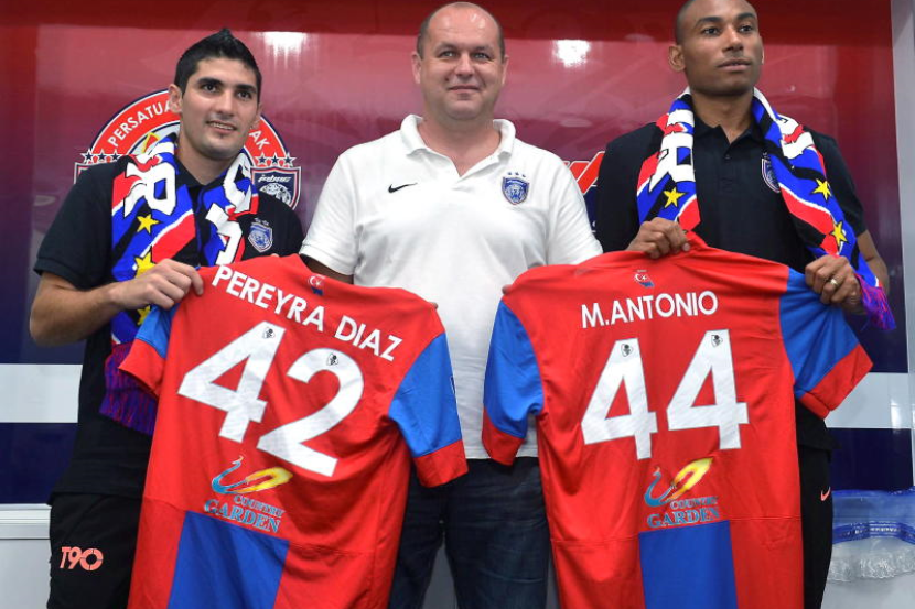 Pengurus Pasukan Johor Darul Ta'zim ( JDT) I, Bojan Hodak menyerahkan jersi kepada dua pemain Import baharu Jorge Pereyra Diaz, 24, dari Argentina (kiri) dan Marcos Antonio Elias Santos, 30, dari Brazil pada majlis sesi memperkenalkan pemain baru kepada peminat di Stadium Tan Sri Hassan Yunus Larkin.