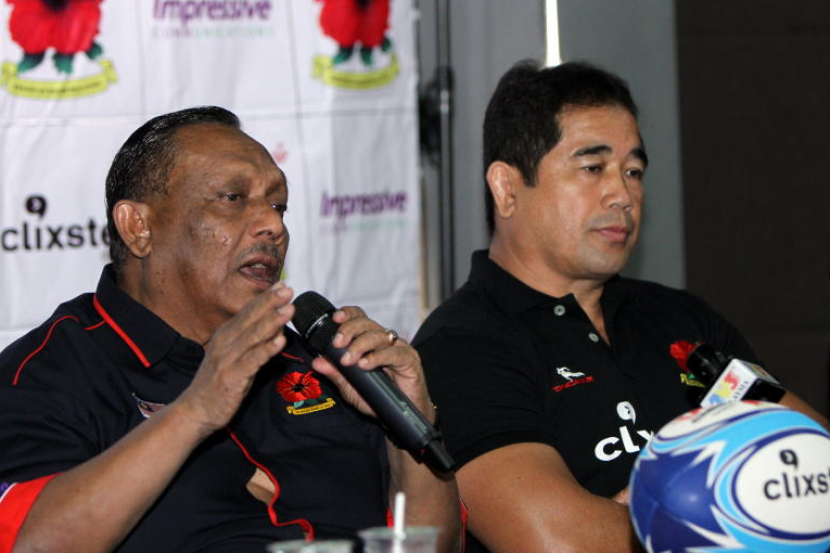 Presiden Kesatuan Ragbi Malaysia (KRM) Datuk Wira Amiruddin Embi (kiri) ketika sidang media mengenai perlawanan 'Asian Five Nations 2014' di Wisma OCM, Kuala Lumpur, Khamis. -fotoBERNAMA