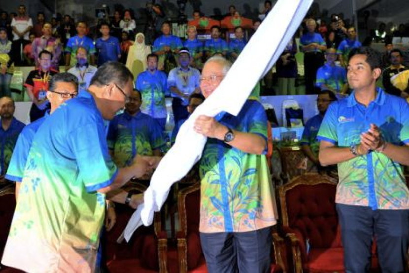Najib menyerahkan bendera kepada Ketua Pengarah Majlis Sukan Negara, Datuk Seri Zolkples Embong (kiri) pada majlis penutup SUKMA XVll Perlis 2014 di Stadium Syed Putra, Kangar, malam Rabu. Turut hadir Menteri Belia dan Sukan, Khairy Jamaluddin (kanan). - fotoBERNAMA