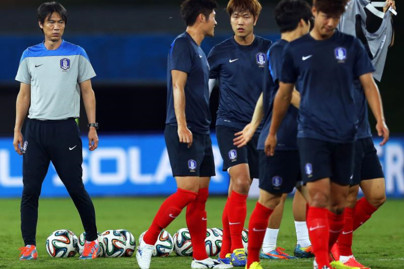 Myung-bo (kiri) memantau anak buahnya ketika sesi latihan terakhir menjelang perlawanan bertemu Rusia.
