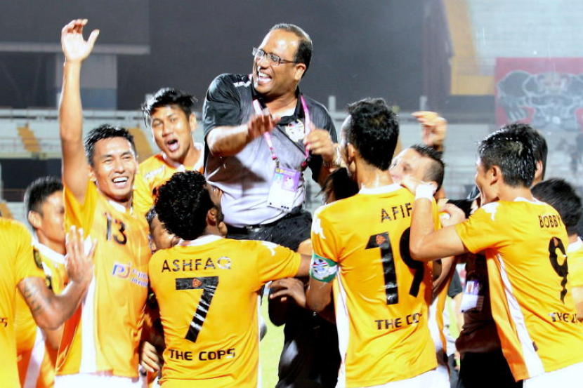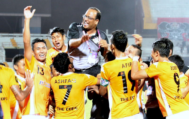 Pemain-pemain PDRM menjulang jurulatih mereka, Dollah Salleh sebaik sahaja donobatkan sebagai juara Liga Perdana 2014.