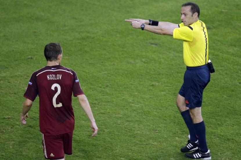 Cakir (kanan) mengarahkan pemain Rusia, Alexei Kozlov keluar padang.