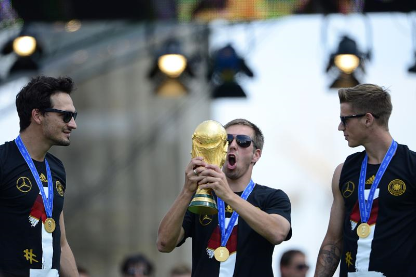 Lahm (tengah) menjulang trofi Piala Dunia 2014 sambil diperhatikan Mats Hummels (kiri)Erik Durm.