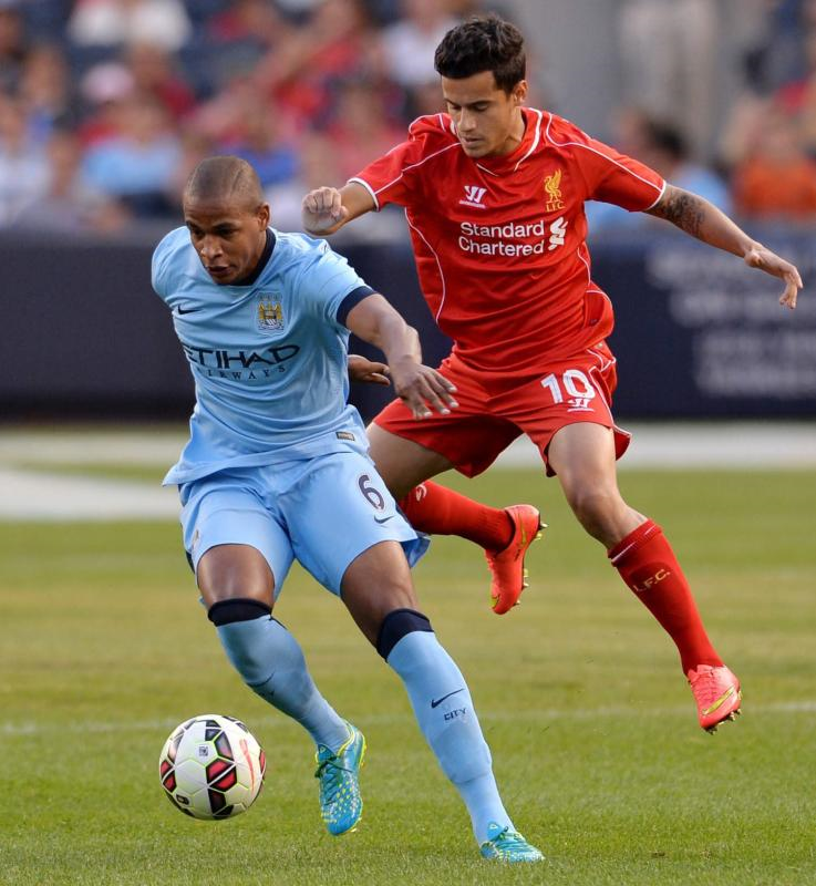 Fernandinho (kiri) menerima tekanan daripada pemain Liverpool Philippe Coutinho.