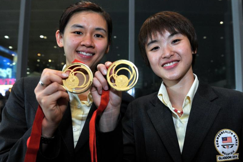 Vivian Kah Mun Hoo (kiri)dan Khe Wei Woon menunjukkan pingat emas yang dimenangi pada temasya Sukan Komanwel Glasgow, Scotland.