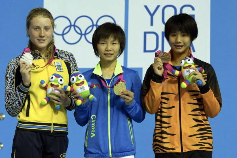 Zhiayi meraih pingat gangsa dalam acara 3m papan anjal individu wanita yang berlangsung di Nanjing Olimpic Sport Centre Natatorium.